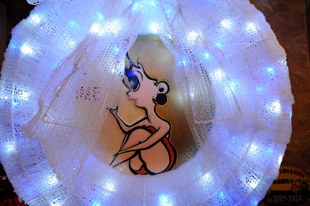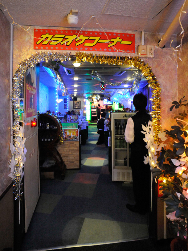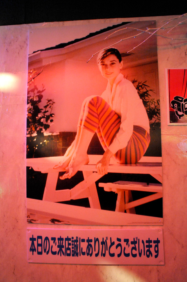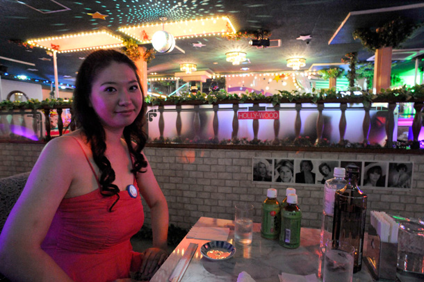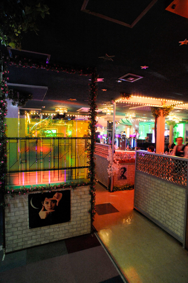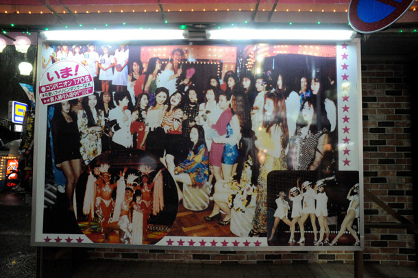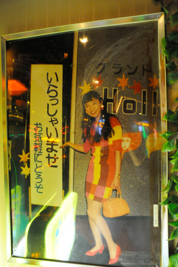 キャバレーだから、ちゃんとダンスフロアもあるし、生バンドも入っているし、毎日のように演歌歌手やコメディアンのショータイムもある。「でもいまは、踊りに来るお客さんもずいぶん減ったし、歌手のひとが歌ってても、あんまり真剣に聴いてくれるお客さんがいないから、かわいそうになっちゃう」そう。そんな店じゃないのに、女の子が座ろうとすると、サッと手をお尻の下に伸ばしてきたりするお客さんも珍しくないそうで、ほんとにしょうがないですねー、いくつになっても、男という動物は。 |
