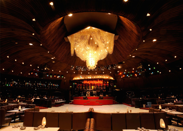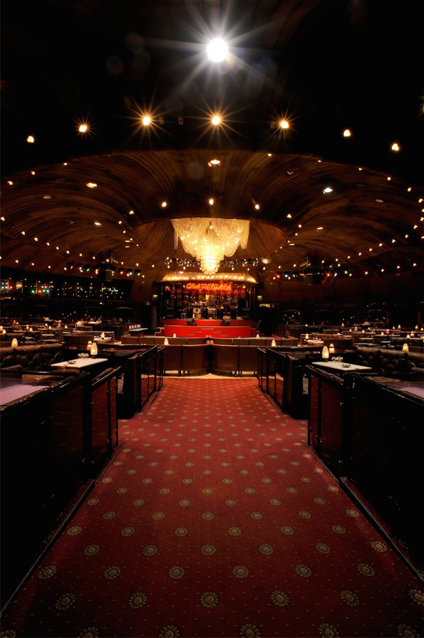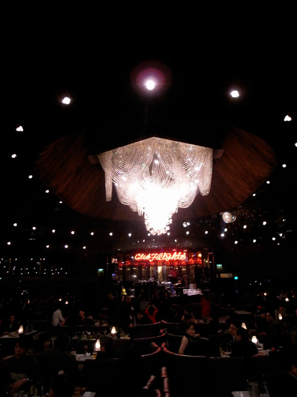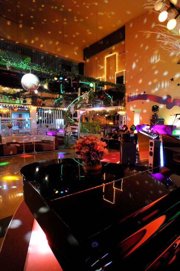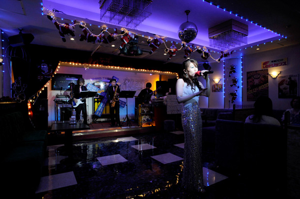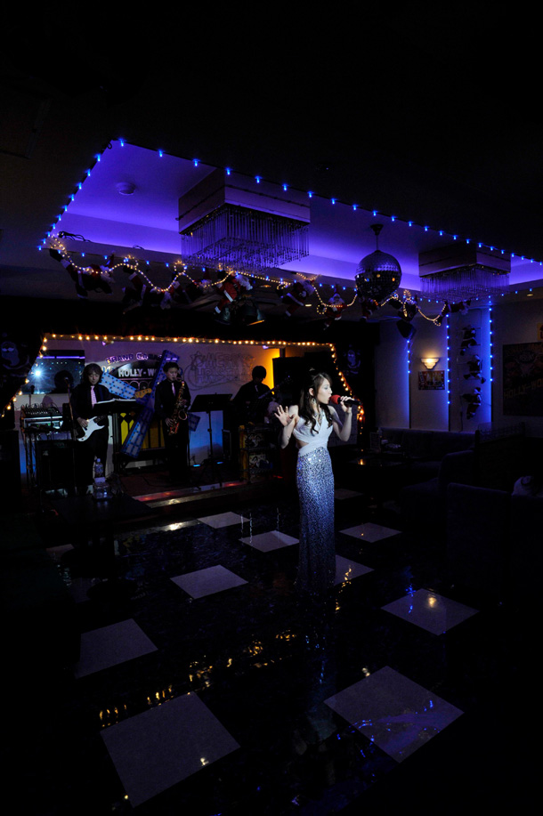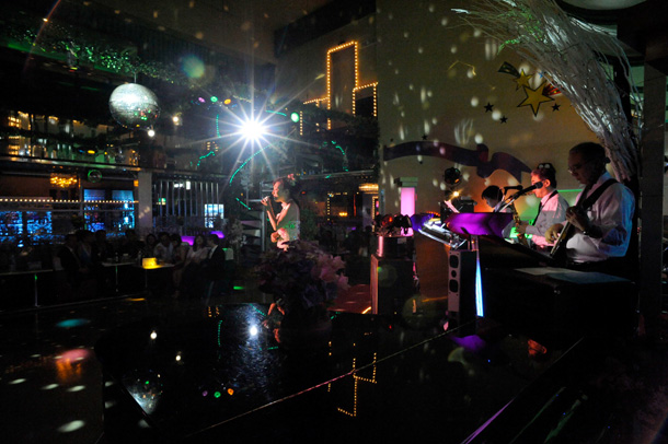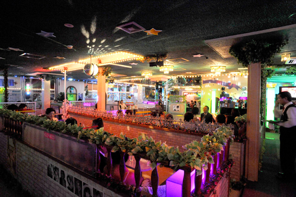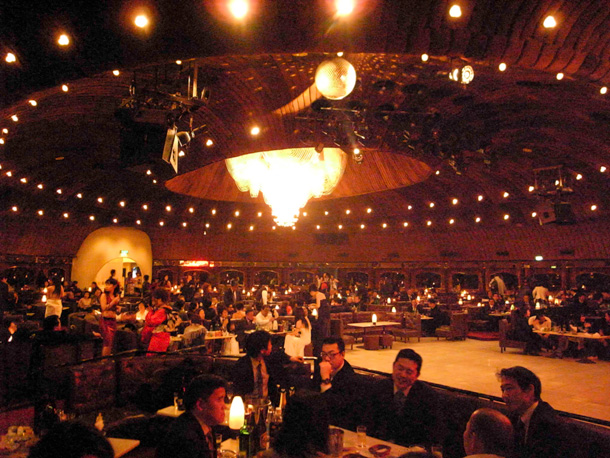 いにしえの高級ホテルのようにゆったりとしたエントランスを抜けると、ボックス席の向こうに吹き抜けのダンスフロアが広がる。専属の生バンドがダンス・ミュージックを奏でる頭上で、光吹雪をまきちらすミラーボール。広さは北千住店の3倍近くあろうか。行ったひとはわかるだろうが、歌舞伎町のクラブハイツが閉店してしまったいま、広さで言えば銀座の名店〈白いばら〉と双璧をなす、いまや東京屈指のスケールである。 |