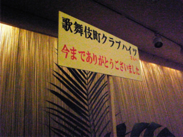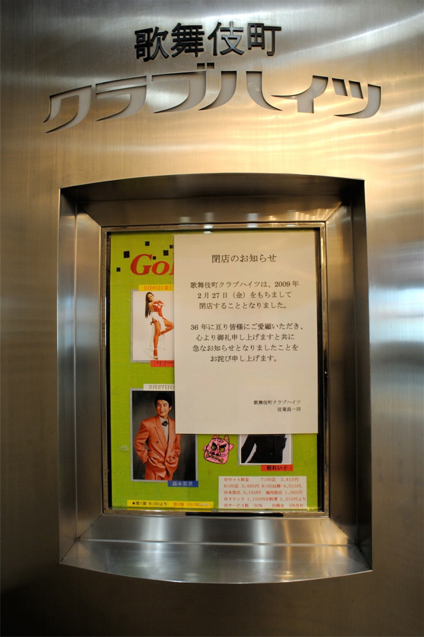 コマ劇場が閉館するときはずいぶんマスコミに騒がれたが、クラブハイツの前にはテレビカメラの列が並ぶこともなく、ただ寡黙な男たちがまっすぐにエレベーターに乗り込んでいくだけだ。出てきても「次、どこ行く?」と騒ぎたてるでもなく、ただひっそりと歌舞伎町の奥へと消えていく。ほんとうに大切なものがなくなるときって、こんなふうなのかもしれない。 |
