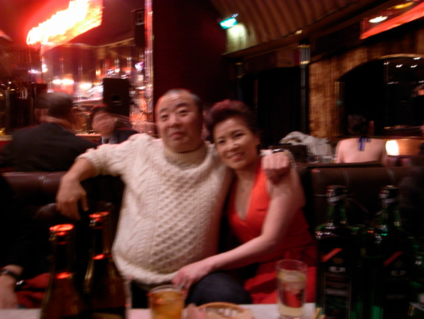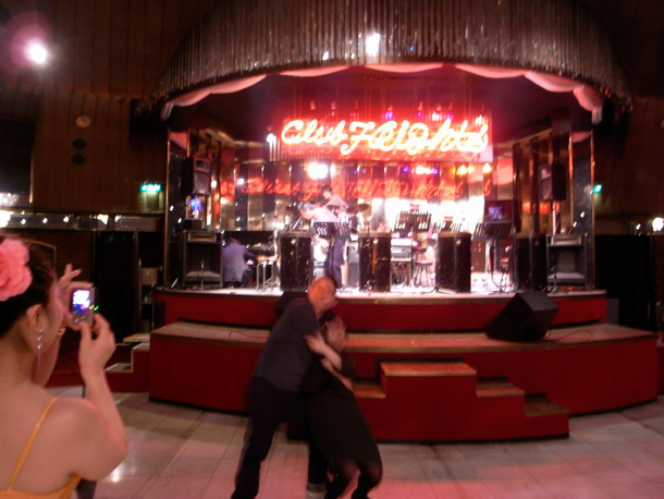 夜11時を過ぎ、バンドはすでに最後の曲を演奏し終え、楽器を片付けている。フロアにはお客さんとホステスさんがたくさんでてきて、抱きあったり、携帯電話で記念写真を取りあったりして、最後の別れを惜しんでいる。顔なじみになった何人かのホステスさんに聞いてみても、みんな「ほんの2週間ぐらい前に閉店って聞いたので、いまはこのあとどこで働けばいいのかわからない」と溜息をつくばかり。とりあえず携帯の番号を交換して、エレベーター前まで送ってもらって、もういちどハグ、ハグ。エレベーターのドアを押さえてくれている高橋さんも、直前まで病院で療養中だったのを「こういうことなら、出てこなくちゃなりませんから」と無理して来たので、明日からはまた療養生活に戻ると、疲れきった表情だ。 |