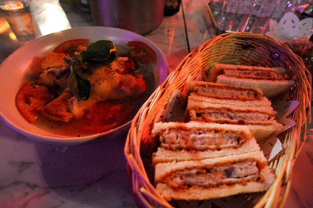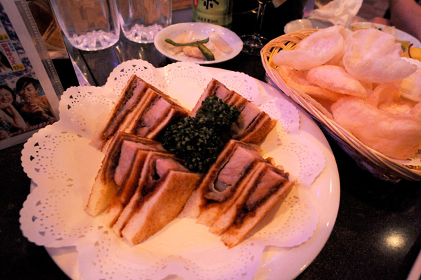 そんなバカ話に興じて、なぜかキャバレーにはどこもつきものの、おいしいカツサンドを頬張って(ちなみに北千住店では、ほかにイカの一夜干しとかがおすすめだそうです)、ナマの歌も聴いて、気が向いたら同じフロアにあるカラオケ・コーナーにホステスさんともども移動して歌いまくって、それでお会計のほうは、7時までに来店して制限2時間の「セブンコース」なら、おひとりさま5,250円! しかも焼酎・ウイスキーのいずれかボトル1本、またはビール2本に、お料理1品付き! キャバクラなんかで、こっちの財布しか興味ないのが見え見えのキャバ嬢の、こっちが話し合わせてご機嫌とって、それで何万円も取られるより、ぜんぜんいいでしょ! |