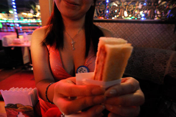 「どんなお客さんが来るの、年配の人が多いから、遊び方もゆったりしてるんでしょ?」と、隣に座ってくれた子たちに聞いてみたら、「いーえ! 男の人は60代になっても、70代になってもいっしょ、だいたい7割のお客さんは、わたしたちを口説くために来てるんですから」と意外なお答え。入店する前にちゃっかり結婚指輪を外してくるひとも少なくないらしいが、「ゴルフとかしてるひとだと、焼けてないからわかっちゃうんですよねー、すぐに」(笑)。 |