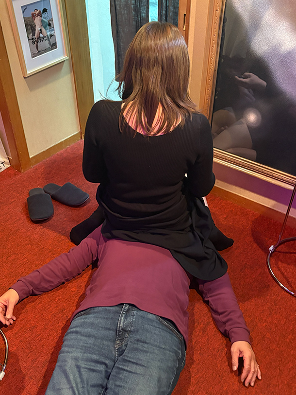 「後ろから前からどうぞ~」で挟んでくれるmimiさん。挟まれてるほうも、気持ちよさそうですね~~。当日はロングスカートだったけど、このために見せてもいいパンツ着用!という万全の態勢で参加してくれました。 |