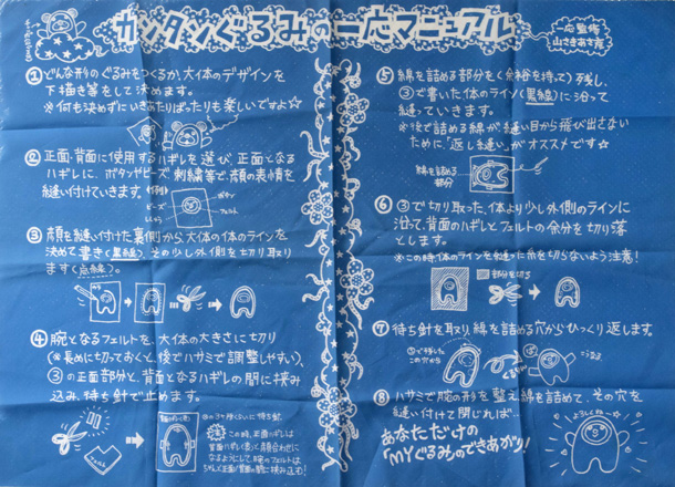 帰り際に山さきさんは、「ワークショップのときはこんなの配ってるんです」という、布にプリントされた『カンタンぐるみの一応マニュアル』を見せてくれた。「どんな形のぐるみをつくるか、大体のデザインを下描き等をして決めます。何も決めずにいきあたりばったりも楽しいですよ!」というところから始まって、「ハサミで腕の形を整え綿を詰めて、その穴を縫い付けて閉じれば・・あなただけの『MYぐるみ』のできあがり!」まで、たったの8工程。難しい図とか、一切なし! |